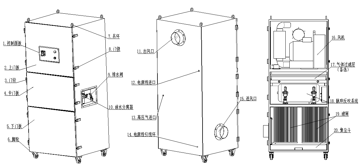 SRA-950XPF防爆脈沖反吹清灰凈化機(jī)高壓風(fēng)機(jī)和三層過濾系統(tǒng)組合而成。