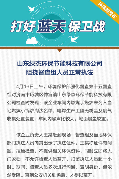| 4月16日上午,環保部督查組對山東綠杰環保節能科技執法受阻一事引起[吊頂式空氣凈化機]環保行業人士一眾關注;由于該公司電焊生產工段無粉塵及廢氣手機處置裝置,車間內噪聲異常打,地面粉塵嚴重等各種原因,環保督察組對其依法采取相應措施,貴公司以證件有問題,拒絕檢查,同事扣留執法人員超一小時,